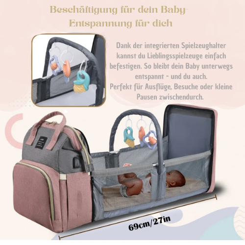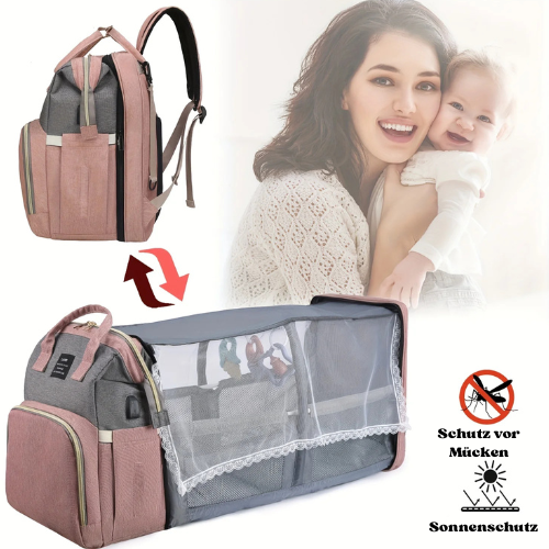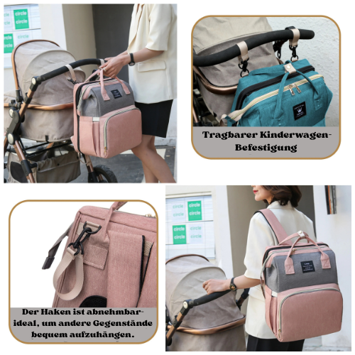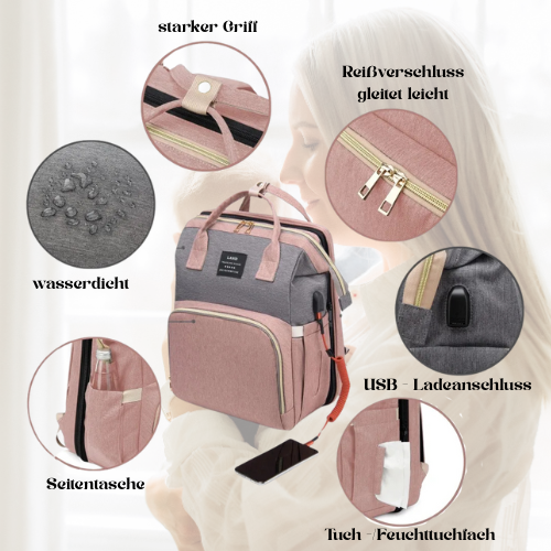 Die SnuggleBag vereint Wickeltasche, Mama-Rucksack und Mobiles Babybett in einem einzigen, durchdachten Produkt.